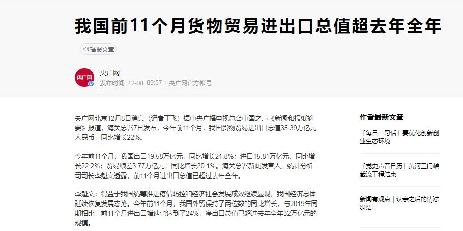 2021年12月8日中央官媒央廣網(wǎng)報(bào)道:今年前11個(gè)月,我國貨物貿(mào)易進(jìn)出口總值35.39萬億元人民幣,同比增長22%。今年我國用了11個(gè)月時(shí)間就超過了去年全年的進(jìn)出口總額,可見今年中國的外貿(mào)市場有多火爆。中國外貿(mào)的強(qiáng)勁增長少不了中國民營企業(yè)的默默付出,今年上海有家民營物流企業(yè)備受各大央媒的關(guān)注。